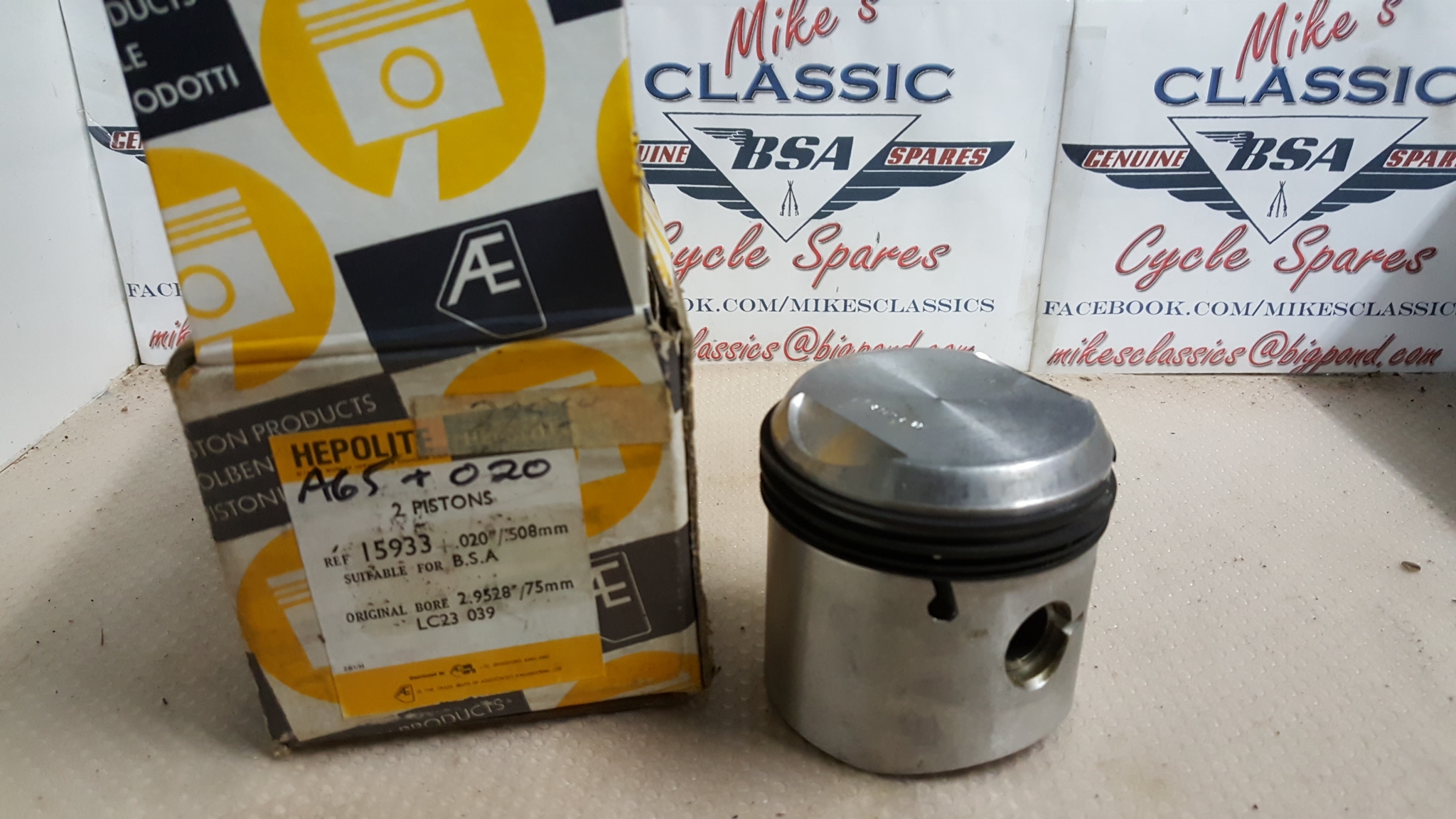 NOS HEPOLITE BSA A65 PISTONS +020 WITH RINGS PINS CIRCLIPS